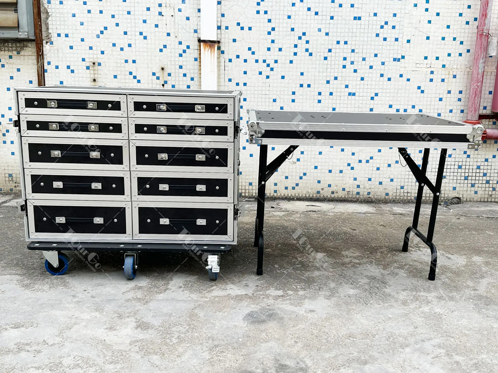 Custom black 10 drawer flight case with table