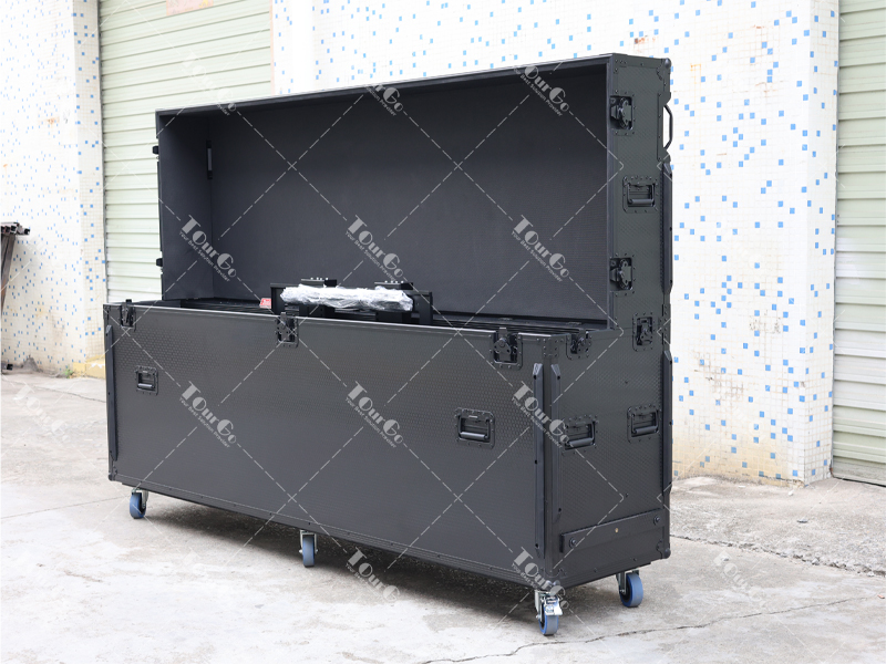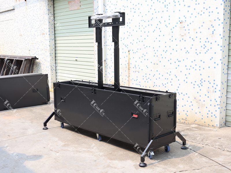 All in Black Motorised TV Lift Flight Case for 98inch Screens with Double Lifting Posts and Support Feet
