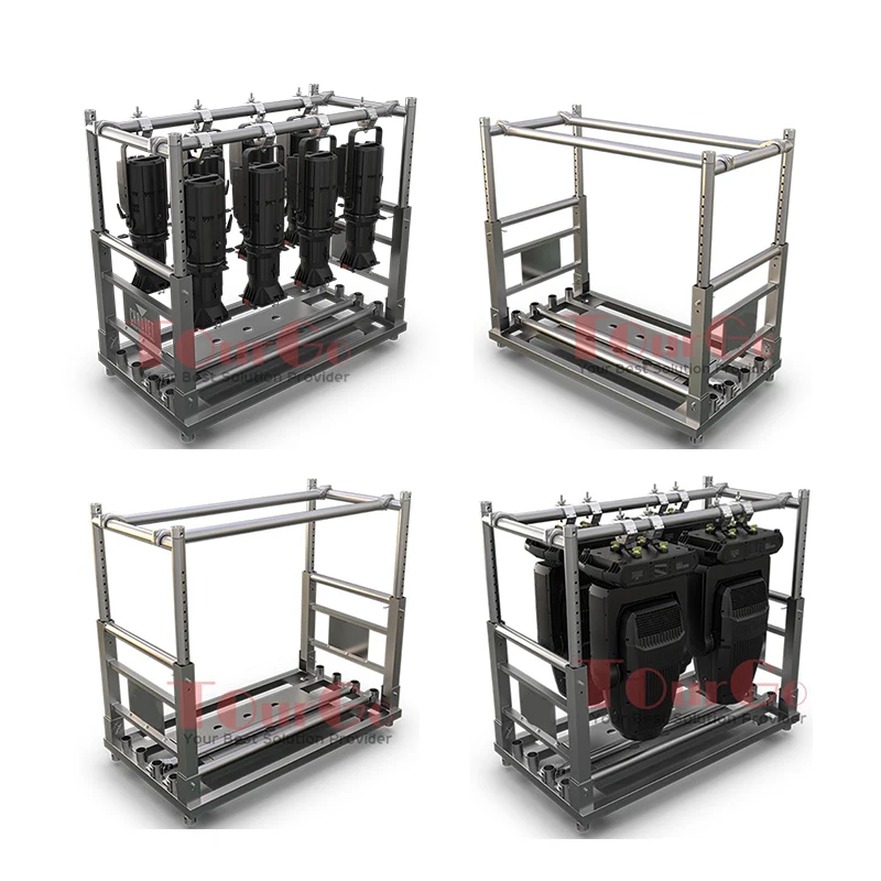 A compact and lightweight rack designed to hold up to 1,000 lbs of lighting fixtures with the ability to raise and lower its overall height and fold down when not in use for easy storage. CP Rack can be stacked two-high, allowing for better space utilization when transporting. The 31.5″ width is designed for a truck pack and at a height of just over 4′ it fits easily in small elevators, through ADA doors, and can navigate hallways to ballrooms and other potentially hard-to-get-to installations.