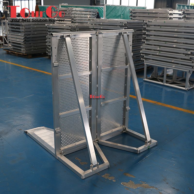 Concr=The Aluminum Barrier is a lightweight crowd control system made of aluminum. The Barrier has a self-weight of only 34 kg per 1 m section. The smooth round top bar and the bottom bar inside of slop incorporate a steel 15 mm slot pin that provides easy connection points for the Barriers. In order to strong the barricade connection, there are also 2 sets interlock and 2 sides bolt connection in case of uneven ground . All profiles have soft, rounded edges for maximum comfort. The design load of the barrier is 10528N/m1.
