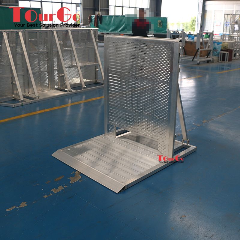 The Aluminum Barrier is a lightweight crowd control system made of aluminum. The Barrier has a self-weight of only 34 kg per 1 m section. The smooth round top bar and the bottom bar inside of slop incorporate a steel 15 mm slot pin that provides easy connection points for the Barriers. In order to strong the barricade connection, there are also 2 sets interlock and 2 sides bolt connection in case of uneven ground . All profiles have soft, rounded edges for maximum comfort. The design load of the barrier is 10528N/m1.