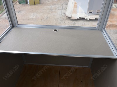 6. standard 6 wall panels(3 of which have windows with acrylic and 1 door panels), 2 roof panels , 1 working table. the booth also have 1 cable ducts