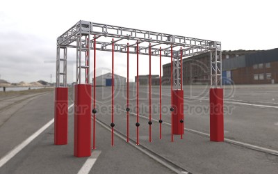 Participants transverse this obstacle just like the “Sea of Poles”, however the added balls provide an introductory method for those with less experience. They can wedge their feet against the polls above the balls and not worry about slipping down, or they can stand on the lower balls similar to the “sea of balls” obstacle. Upper body strength, good grip, and lower body are all engaged when using this obstacle.
