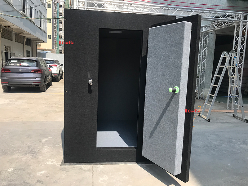 Audio Recording booth, comfortably fits two people inside. Equipped with lighting, airflow and outlet inside. There is a window view into the main room from inside the booth. The sound booth is part of a larger room that has two desks located just outside which can also be utilized for equipment and technician. Great for any sound recording needs such as ebooks or podcast episodes.
