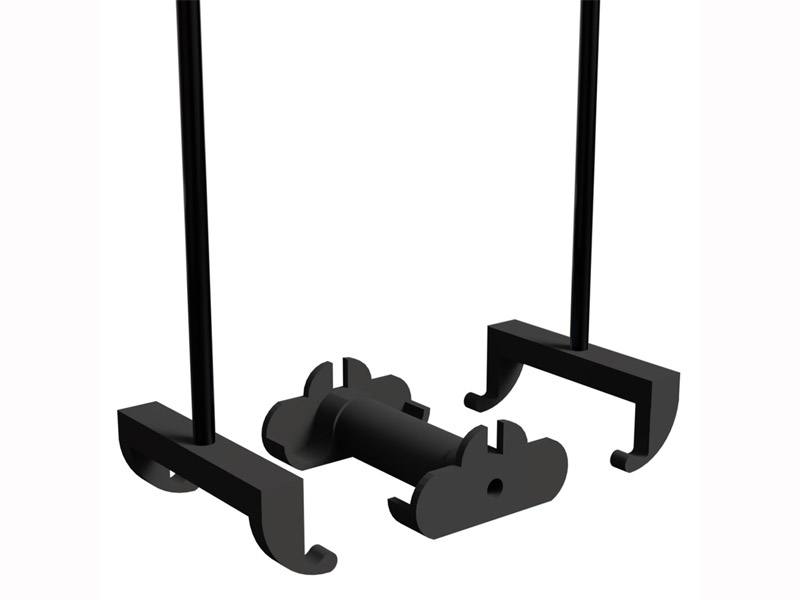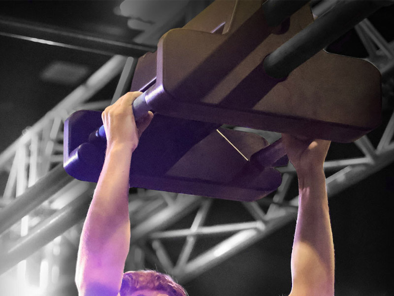 The Monkey Hop is a ninja obstacle designed to challenge grip strength, control, and explosive coordination. This obstacle includes one center-mounted slider, two wooden cradles, and two aluminum pegs. Athletes begin by placing a peg in each side of the unstable slider, which mounts to a horizontal pipe. Using the pegs, they must shimmy the slider down the pipe, but the real challenge comes at the end.
